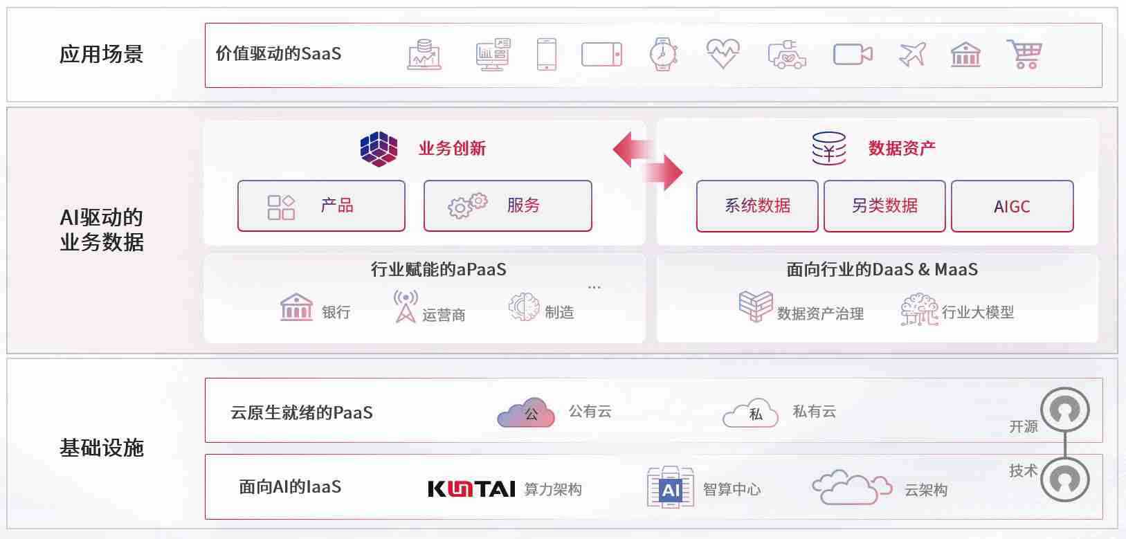 数字时代,,围绕企业数字化转型的关键要素,,,Z6尊龙数码开创性的提出数云融合战略和技术体系框架,,着力在云原生、、、、数字原生、、、、AI原生和信创产业上架构产品和服务能力,,,为处在不同数字化转型阶段的快消零售、、、汽车、、、金融、、、、医疗、、政企、、、教育、、运营商等行业客户提供泛在的敏捷IT能力和融合的数据驱动能力,,,,构建跨界融合创新的数字业务场景和新业务模式,,,,助力企业级客户建立面向未来的核心能力和竞争优势,,,全面推动社会的数字化、、、、智能化转型升级。。。