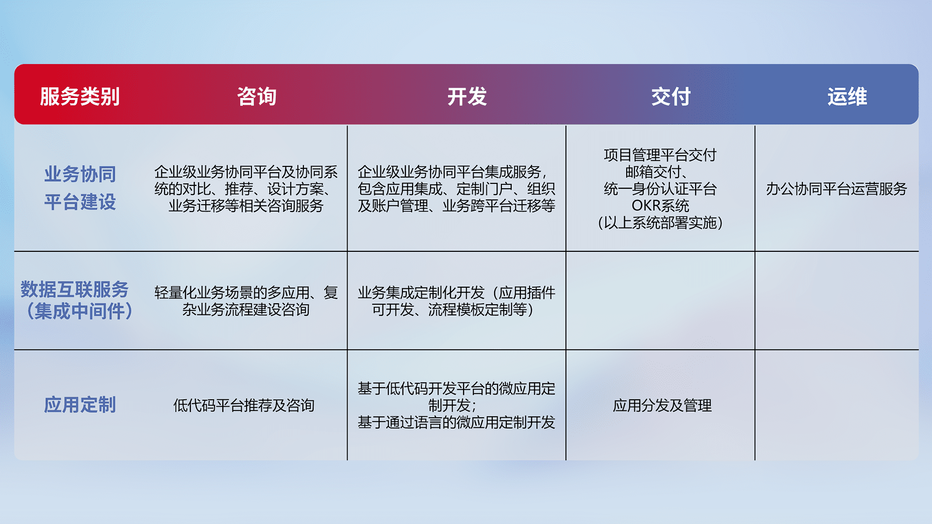 针对钉钉、、、企微、、、、IDaas等平台级产品提供产品的规划、、、、方案、、、、交付、、、、定制化开发等服务,,,实现如统一协同办公、、、智能客户服务、、混合会议管理、、智能数据查询、、、等业务场景,,,实现数字化转型。。。